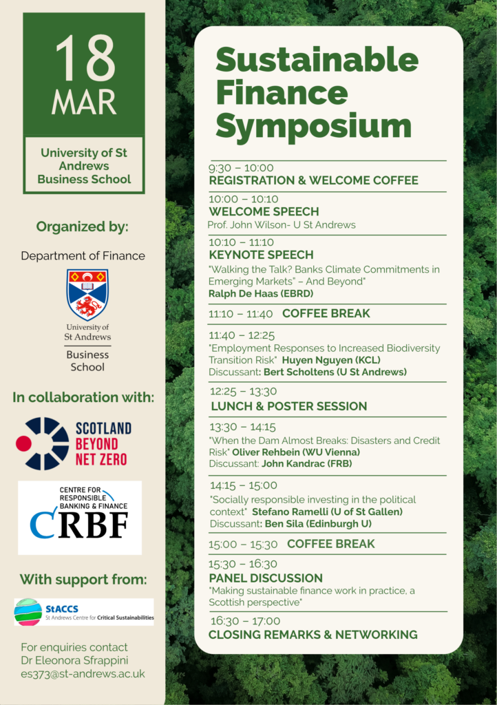 How resilient is our financial system to climate risks? Can the financial sector actively support the transition to a sustainable economy—or does it hinder it? The Department of Finance of the University of St Andrews Business School is bringing together leading academics and experts to explore these critical questions at a one-day Symposium on Sustainable Finance.